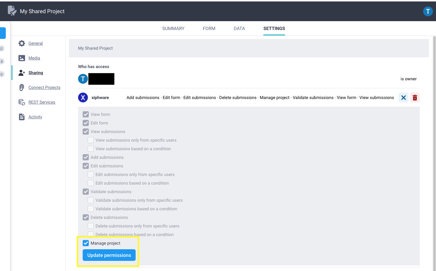 Welcome to the community, @mbonniras! This occurs when a project is shared with you under restricted sharing permissions. To gain access to the settings tab, you may want to contact the administrator who shared the project with you to discuss adjusting the sharing permissions.