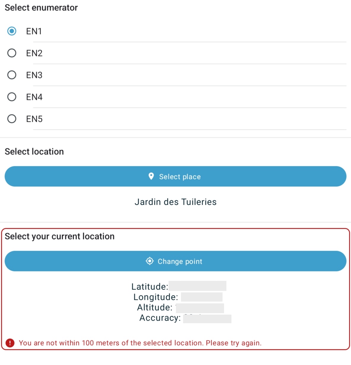 - Add a constraint to ensure the enumerator is within a certain perimeter of the selected location (here, 100 meters), using the distance() function