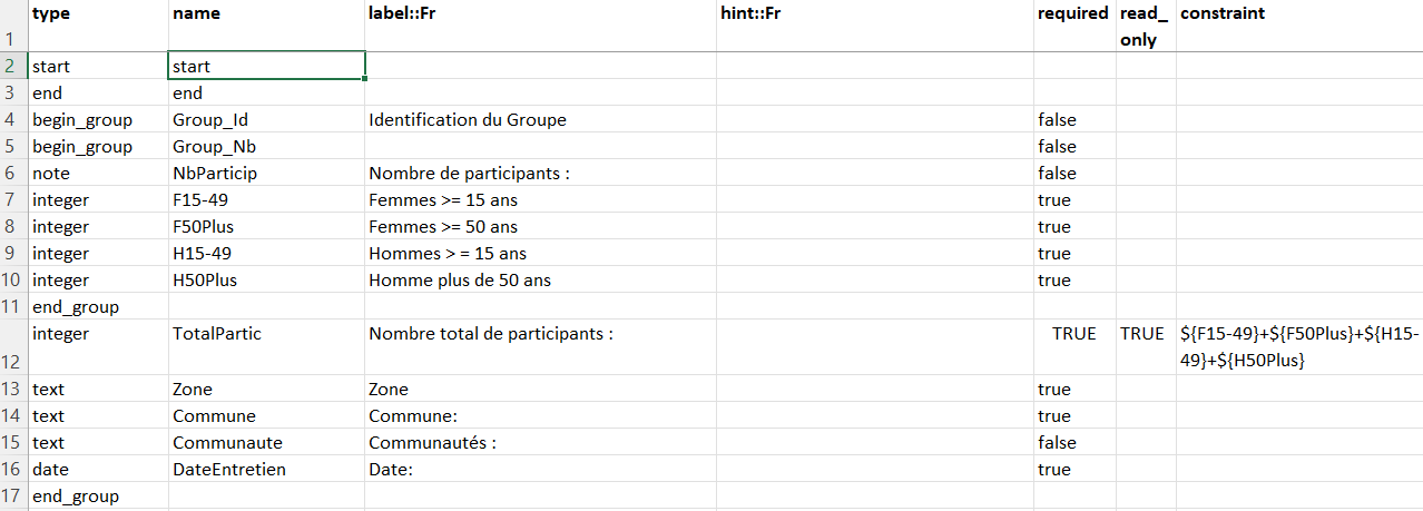 I have included a calculated field in XLSForm so that it becomes visible to the surveyor after he/she has filled in previous questions. As this field references previous questions, it has been placed outside the Number of participants group as shown below