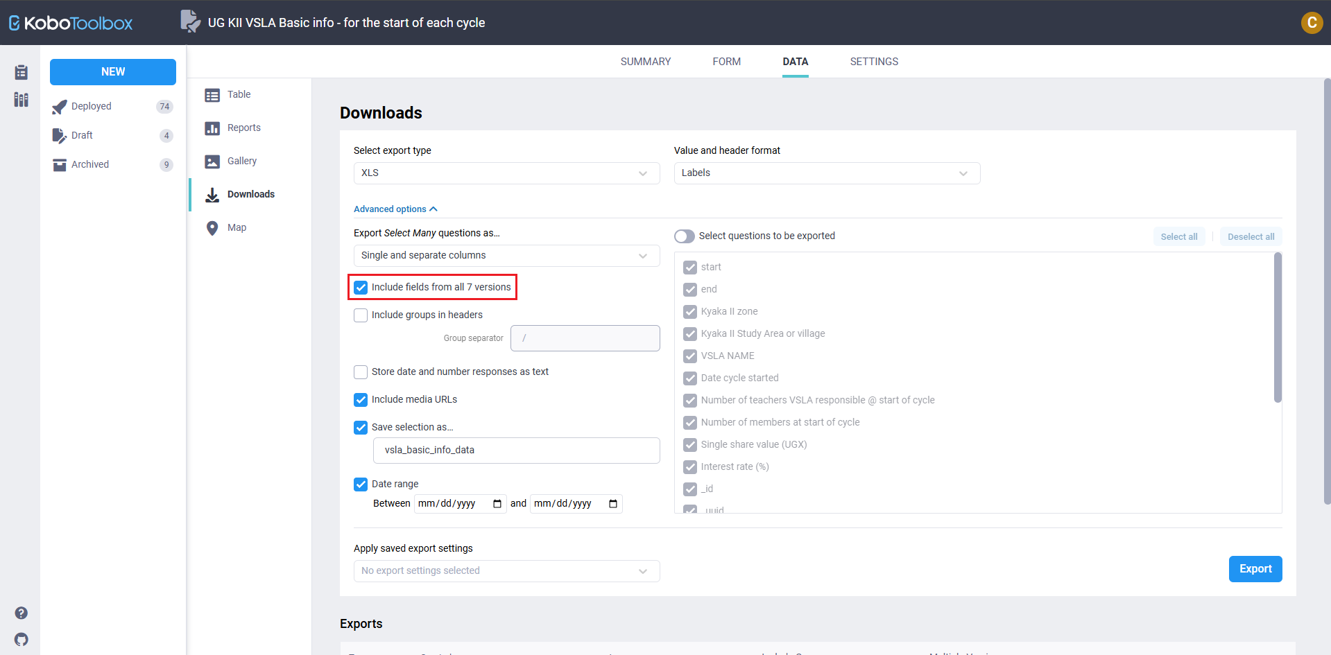 Project>DATA>Downloads>Include fields from all … versions