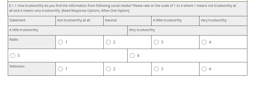 No, I wanna set one row as one single option, very trustworth, a little trustworthy all are options for Radio, tv and news.