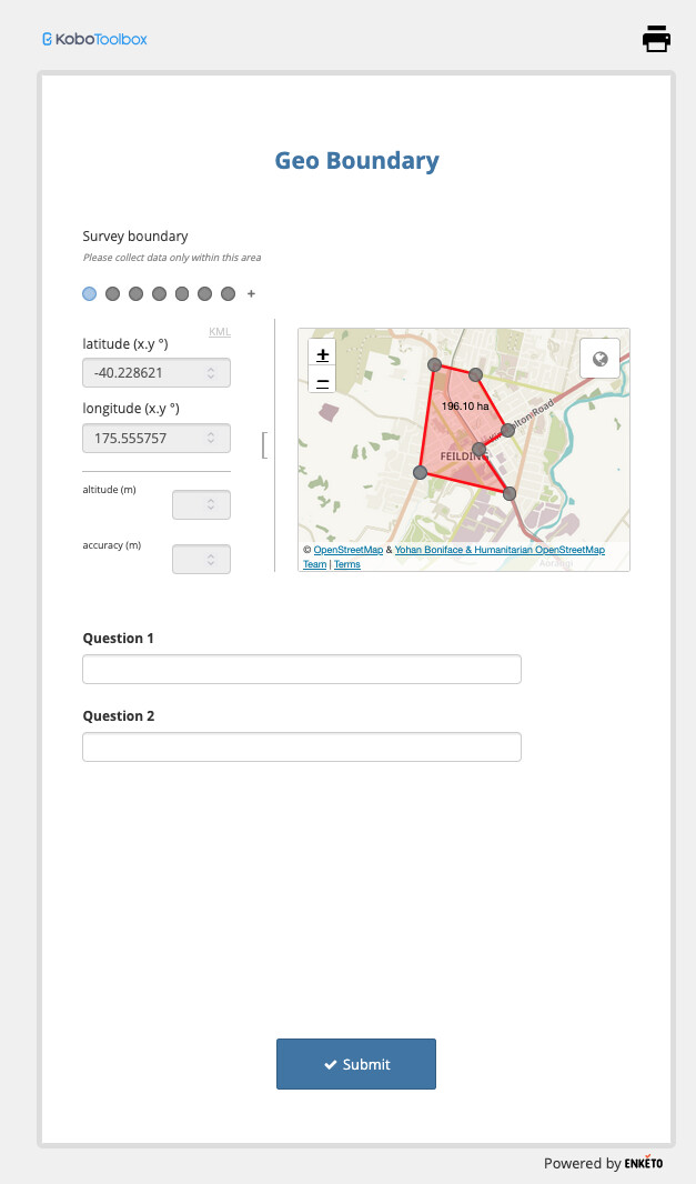 Note, the KoboCollect mobile app has far richer mapping capabilities, including showing additional map layers. It also has the additional capability to enforce an actual geofence on your target area, to ensure the data is in fact collected within where it should be.