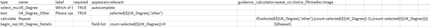 I was adding a simple code in the relevant column of the xlsform stating not(${Degree}=“Others”). It works as long as I only select Others. If I select, for example, Bachelors and also Others, then the repeat group starts to show for Bachelors (as it should) and Others (as it should not).