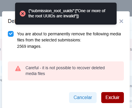 When I select some submissions from my Kobo form and try to delete only the media files (using the “Download media files only” option), I get the following error: {“submission_root_uuids”:[“One or more of the root UUIDs are invalid”]} Has anyone faced this issue? How can I properly select and delete only the media files without getting this error?