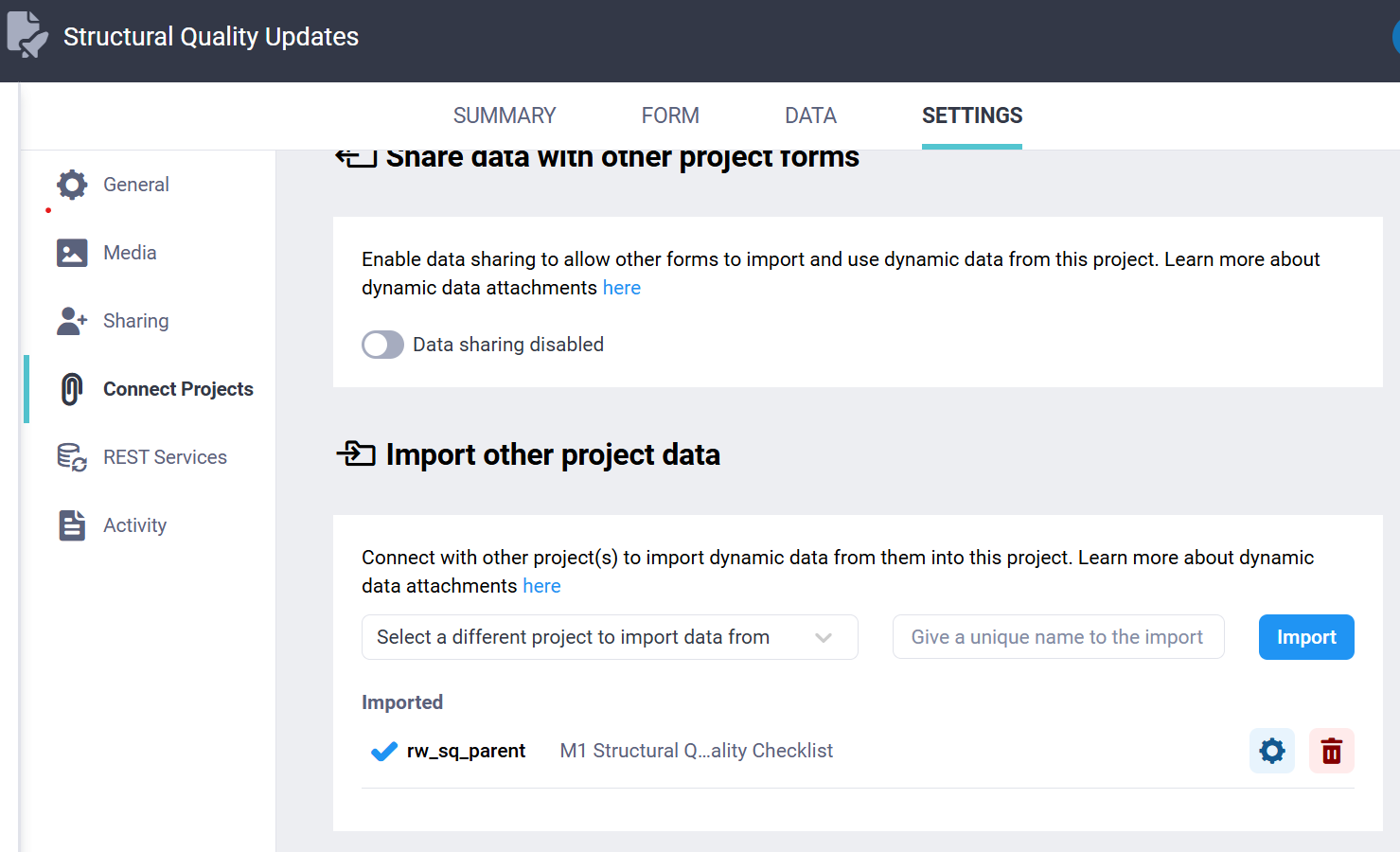 My parent form is ‘RW SQ Kobo live’. My child form is ‘RW SQ Updates kobo draft - short version’.