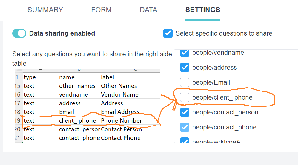 I decided to break up the xlsform into small bits and upload a section at a time, fill with data and share the fields to discover what the problem is. I got to a point where just one particular field kept bringing up an error message (posted below) and I really can’t understand why. I can select several other fields to share (before and after this field), but the moment I pick the field, i get stuck again. I have also included a snapshot of the xls file for this section. My next step will be to duplicate this field, give it a new field name and see if I| can share the new one, if it works , i’ll delete the old one.