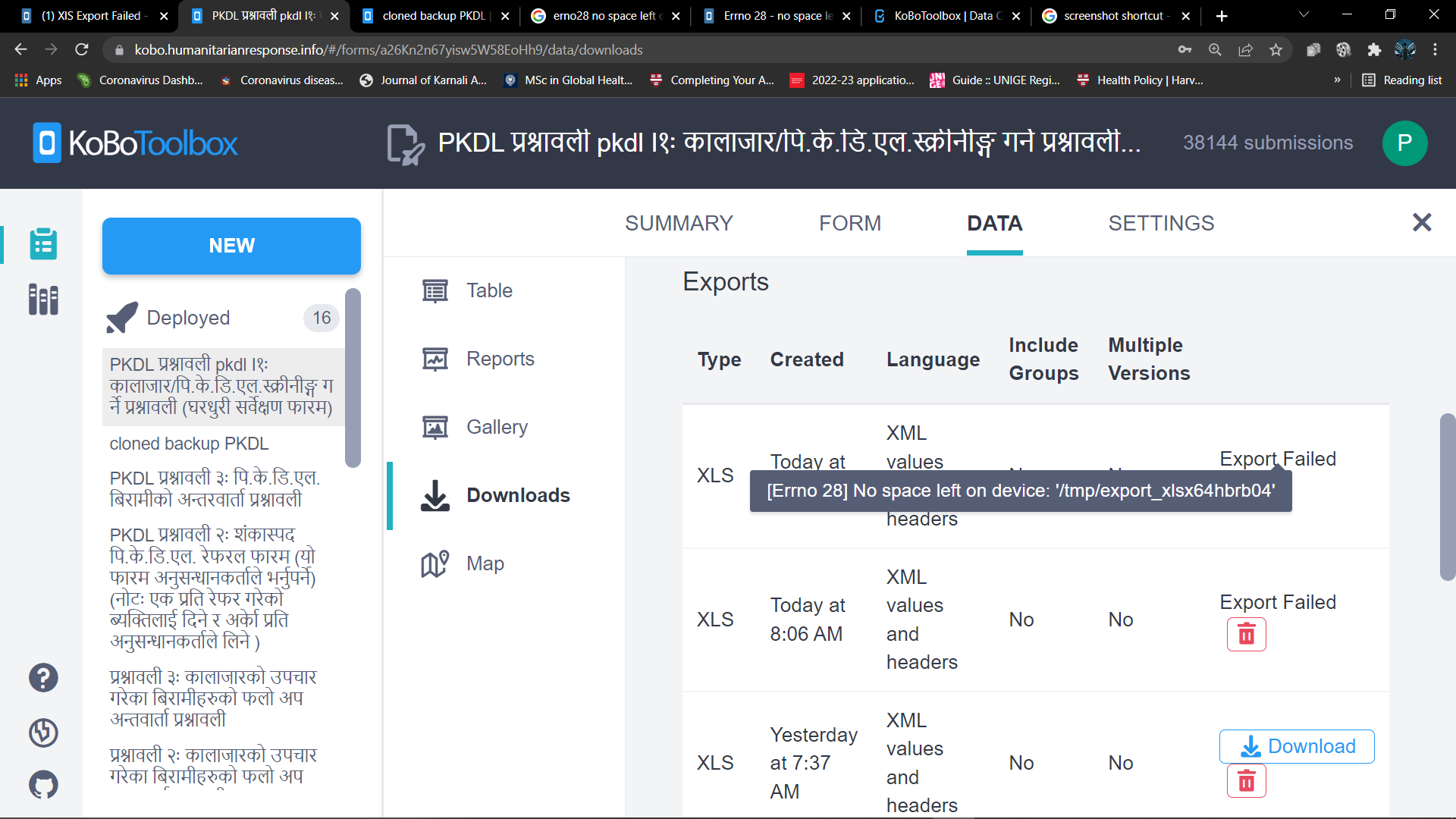 When i try to download my data it shows me the error - [Errno 28] No space left on device: ‘/tmp/export_xlsx7et0rss0’