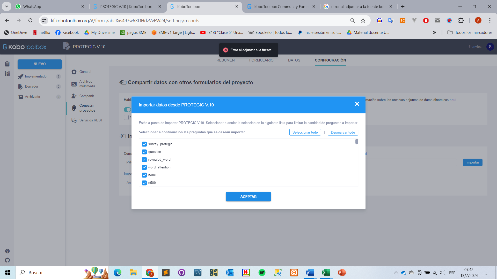 Can you help me, I am wanting to import data from the same form, it has several questions, however before it worked fine, now it does not want to upload the questions, I have that error attaching to source