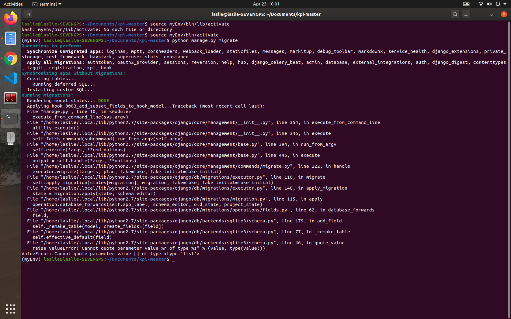 ,because I would like to download the kobotoolbox without docker so since the project is running on Django framework,my purpose was to install all the different dependencies on the virtual environment.So when I run python manage.py migrate I had this message errors that appear “ValueError: Cannot quote parameter value [] of type <type ‘list’>” and when I run the server I see this on the debug window of python " [Errno 2] No such file or directory: '/home/laslie/Documents/kpi-master/node_modules/mocha"ps:I am using ubuntu 19.10