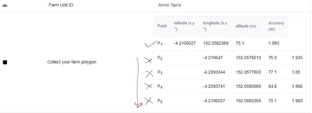 I am using a kobo form builder in my survey. One of the questions in the form is to map the farms (Polygon). I used the area(geoshape) type question and collected the data. However at some point, some polygon coordinates didn’t sink in well when the latitude and longitude coordinates were saved. This caused errors as shown in the attachment. I need to correct/place the coordinates in their right columns before covert to geojson.
