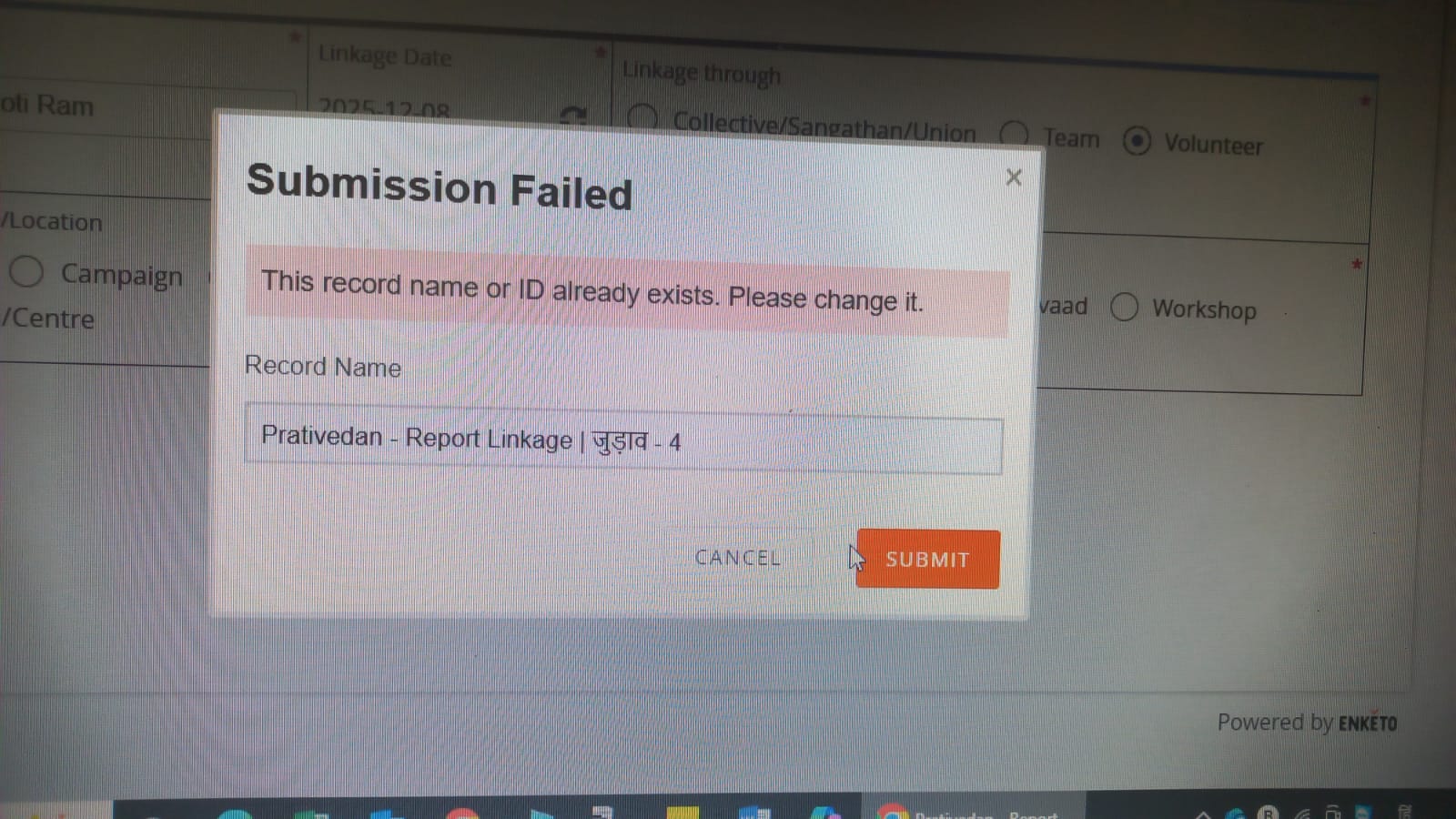 Pop-up Form States "Submission Failed: the record name or ID already exists, Please change it. Record Name: ____; "
