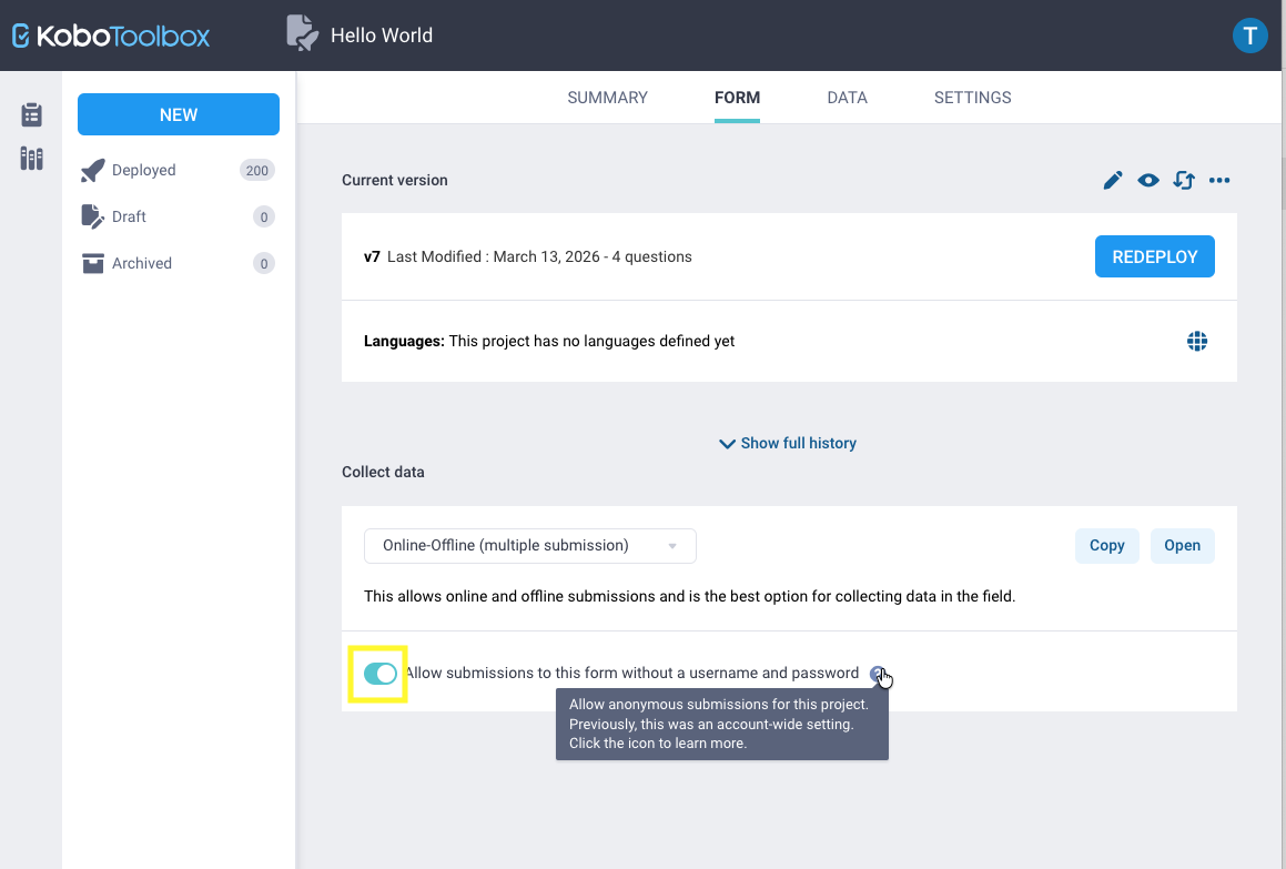 Enabling this will let anybody submit to your project without having to login to Kobo, from either Enketo (via your shared link) or even via KoboCollect (they will need to know your Kobo username however).
