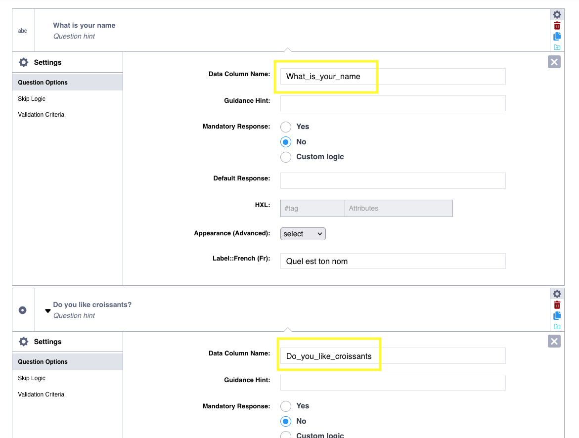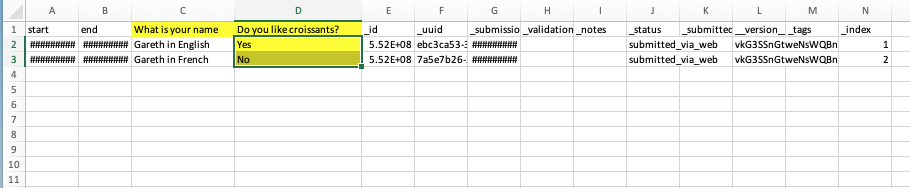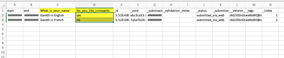 or omitting labels entirely and keeping just the raw XML names (note the Formbuilder’s default underscored question Data Column Names are now the column headers):