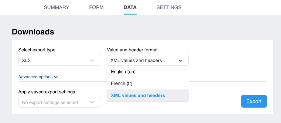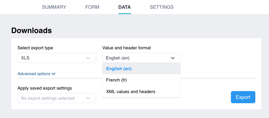 Please note, the exported XLS data format is whatever you happen to pick when you Export it as; this is completely independent of what language was selected when the original submission was filled in.