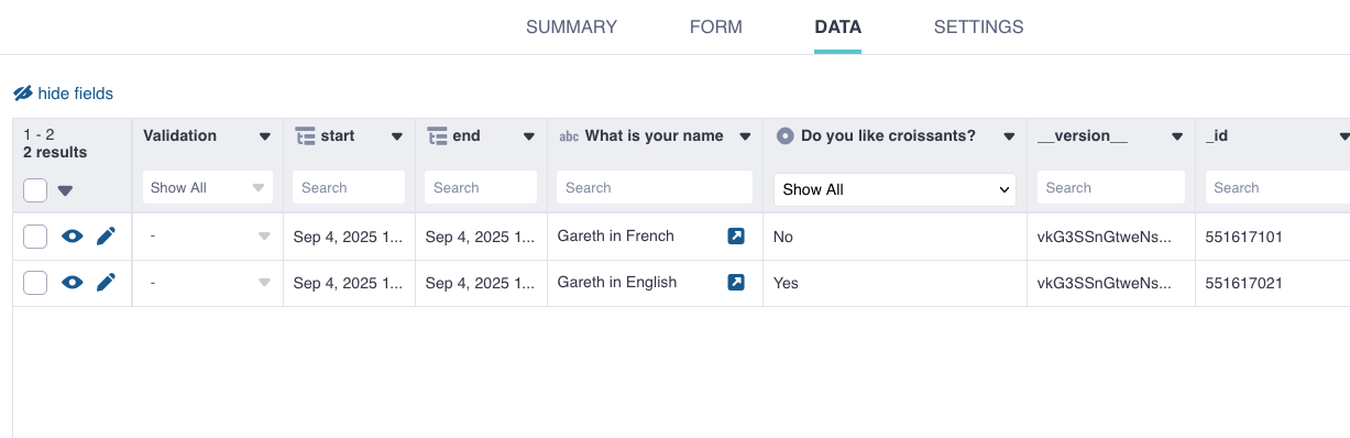 So if you wish to map the raw data back to different languages for, say, external report generator (PowerBi, etc), then you will have to accompany the submission data with the form definition, because it is only the form definition that contains the multi-language translations.
