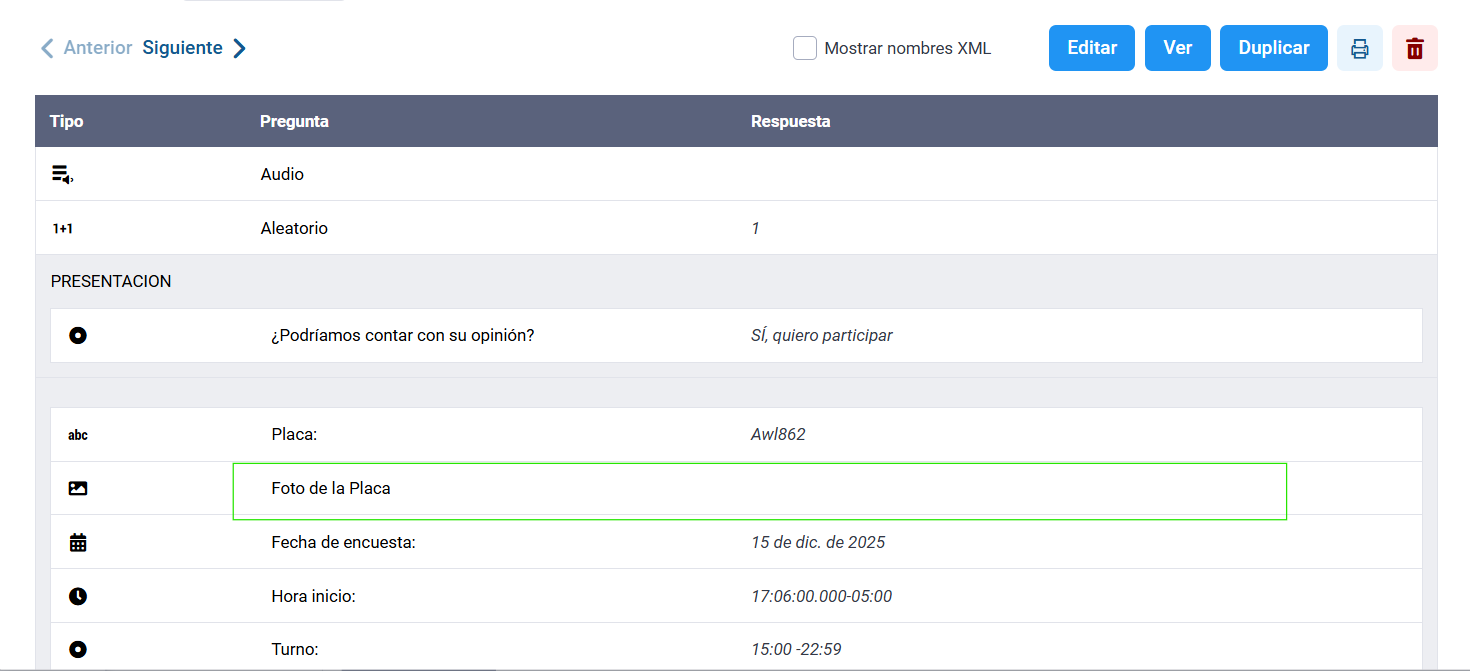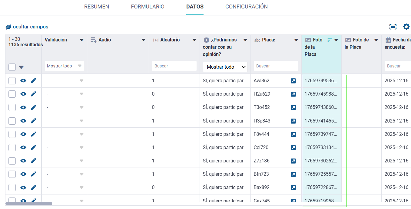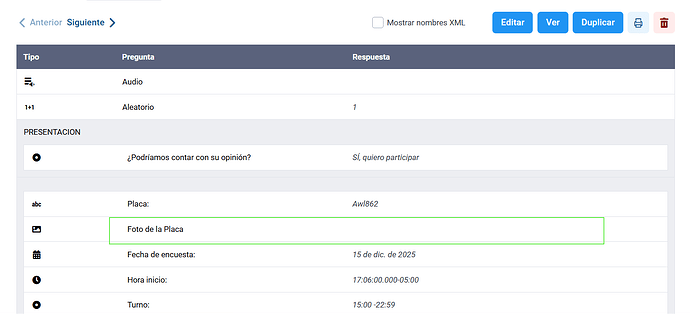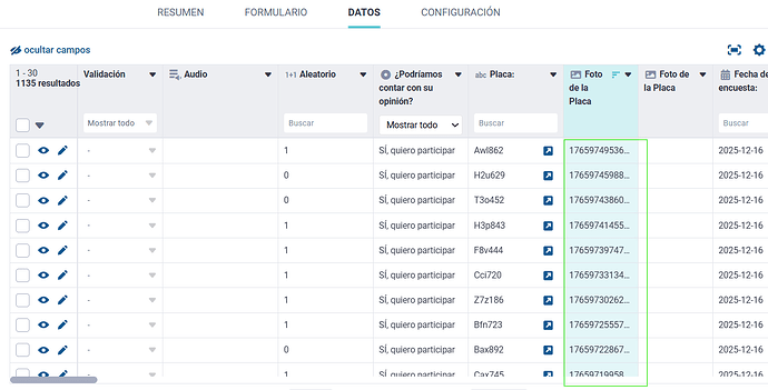 En la primera imagen tengo el registro de las encuestas donde si se nombra el archivo de la foto “Foto de la Placa”.
