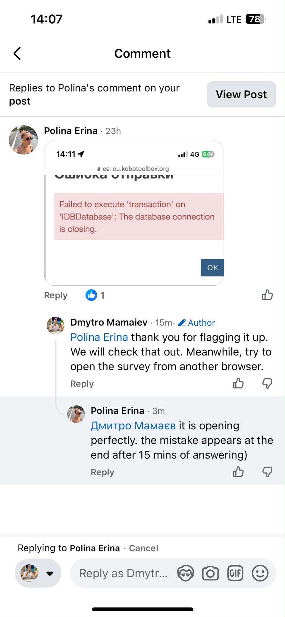 - communicated with respondents about their issues – they had an internet connection to both open the form and communicate with us