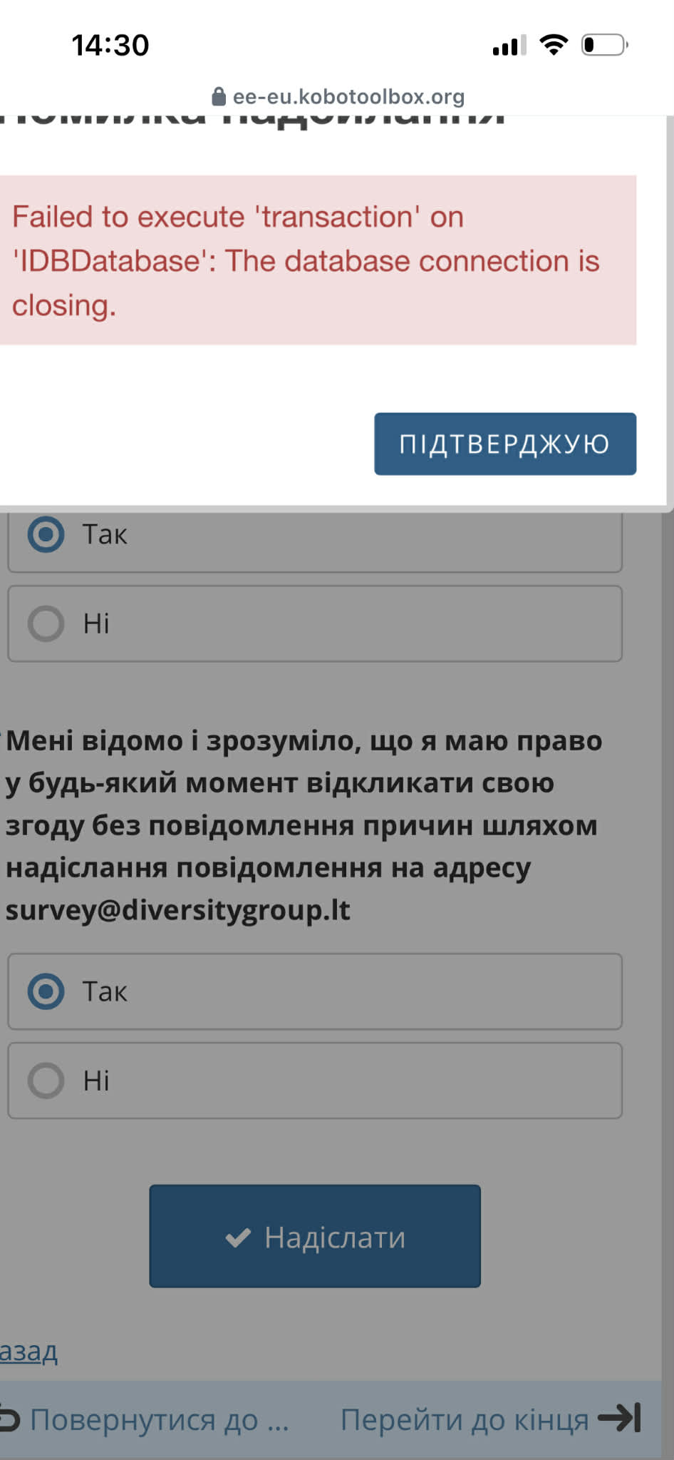 The form is currently being disseminated using online-only (multiple submissions) option – respondents are filling it online individually on their own personal devices. During data collection, we keep getting feedback from respondents that they are encountering error “Failed to execute ‘transaction’ on ‘IDBDatabase’” when trying to submit their completed form.