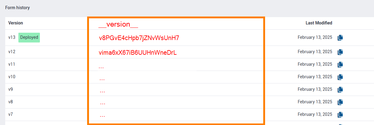 - the submission variable _ _ version _ _ automatically generated by the form. When it gives me the code v3F26XAL5YuDJcXm7L2VjY: are we talking about version 3 of the form since the code starts with v3? If yes, then which version are we talking about when the code starts with vR?
