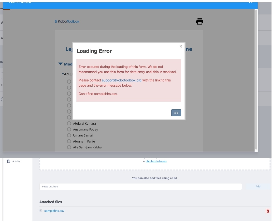 I’m using kobo toolbox for data collection, and I am using preloaded data in my survey. I’ve uploaded the csv file with the data to preload, but I keep getting an error message as if the data set was not found. In attachment I’m sending you screenshots of what I see.