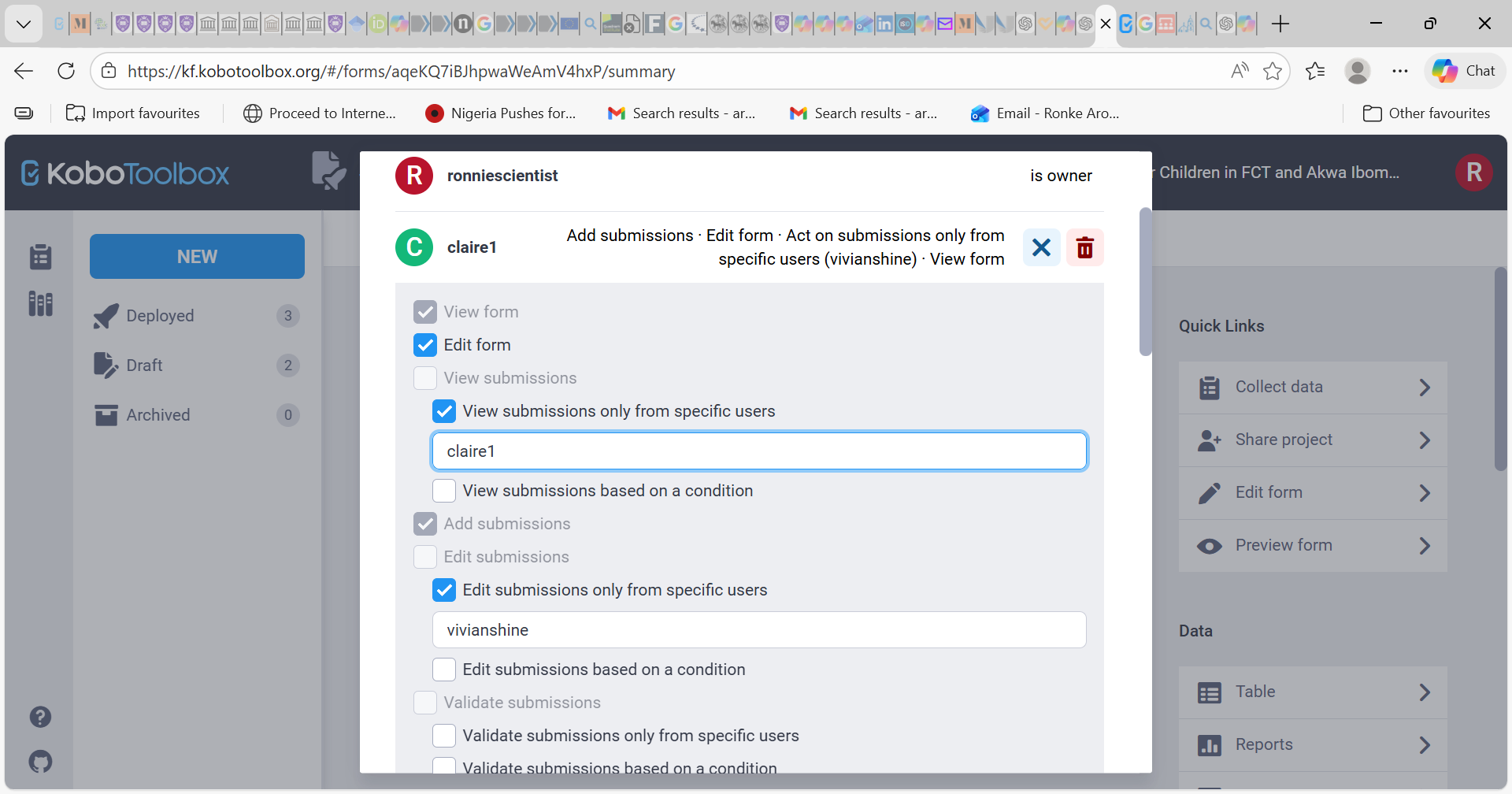 The “View Submissions for Specific Users” permission is still not working. The enumerator cannot see any submissions even after I update this permission.edit permissions does still not allow them see submitted data entries. The issue remains unresolved.