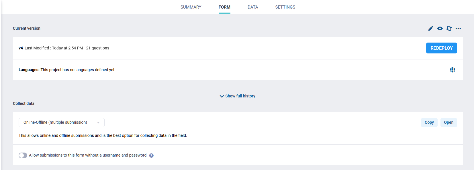 This setting requires enumerators to log in before making a submission. With this feature enabled, enumerators will have the ability to view their own submissions in their project dashboard. However, it is important to note that these viewing permissions will only take effect after the setting has been applied to your project and the enumerators have submitted data. Any submissions made prior to this configuration (sharing permissions) will not be accessible. Sharing permissions will only apply to submissions made after the configuration is implemented and data begins to be sent to the server.