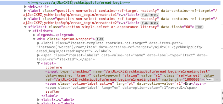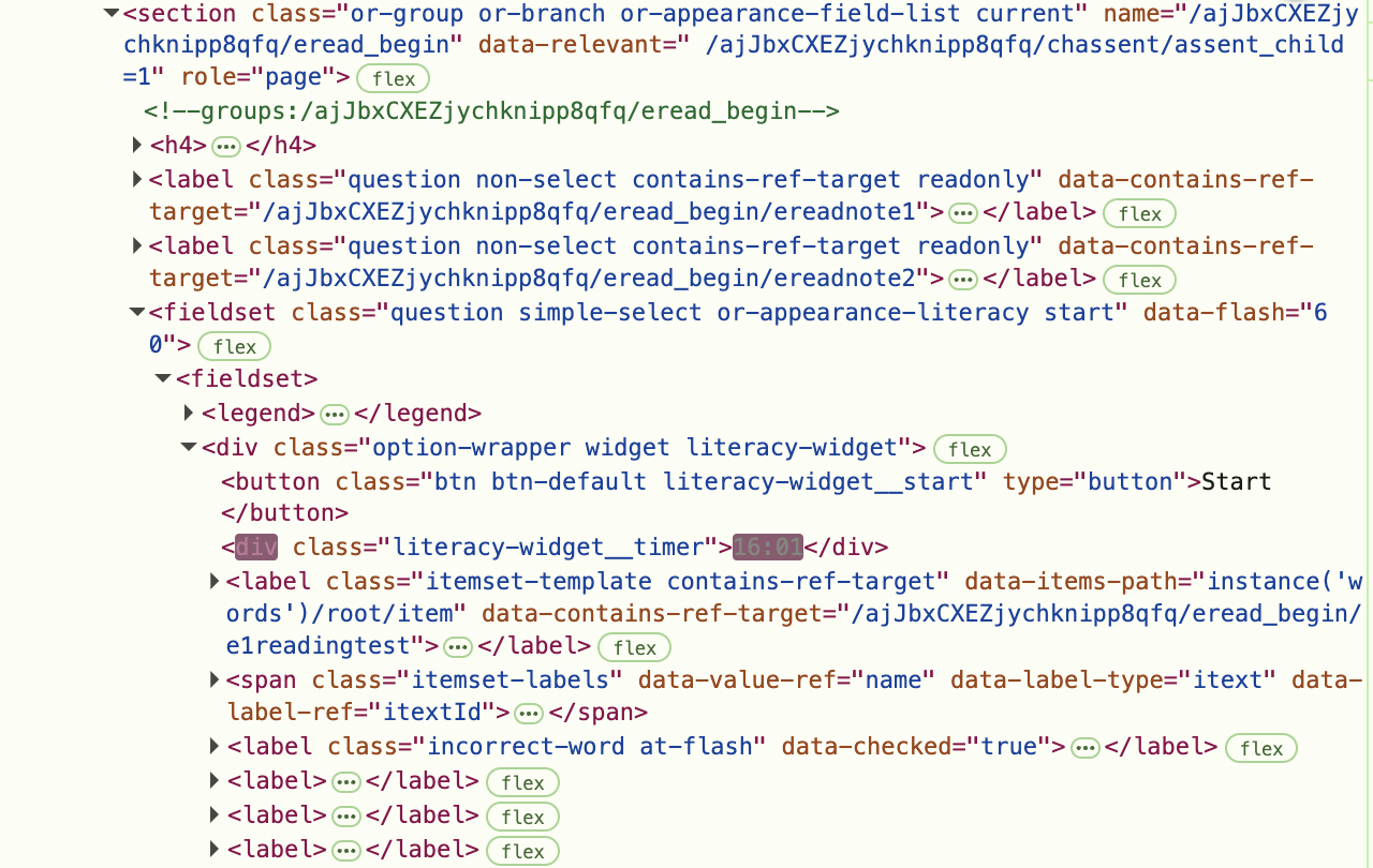 @Kal_Lam I think this may be a cache issue. The form works on devices that have previously loaded the literacy widget on previous form deployments for different projects (e.g., mine, yours, a couple others). However, it doesn’t work on devices that have never loaded the literacy widget. When I look at the elements of each in the screenshots below, we can see that the literacy widget doesn’t seem to load as a style for the device/browser that has never loaded the literacy widget. Could the widget asset be broken but because it’s cached on some machines it works correctly on those?