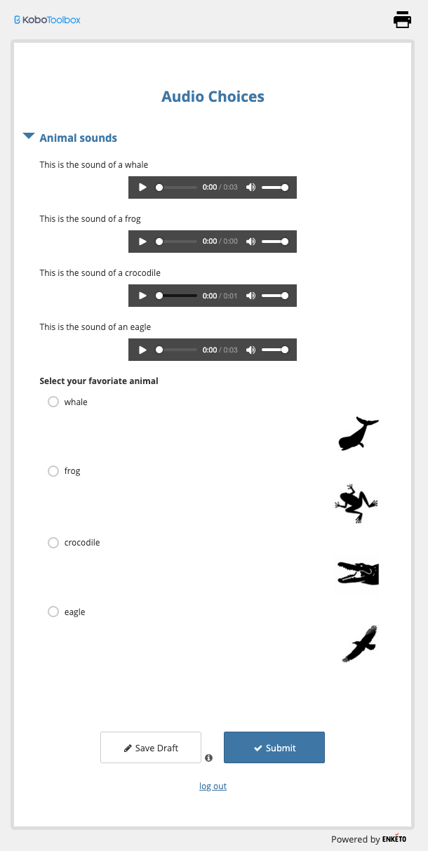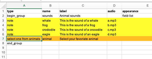 Note, if you run this under KoboCollect you will still get these notes - and the select options - now with both having the audio clips that can be played . put everything in a field-list to keep them all on one screen: