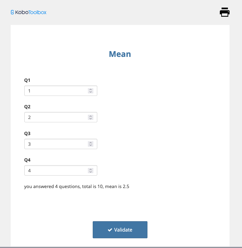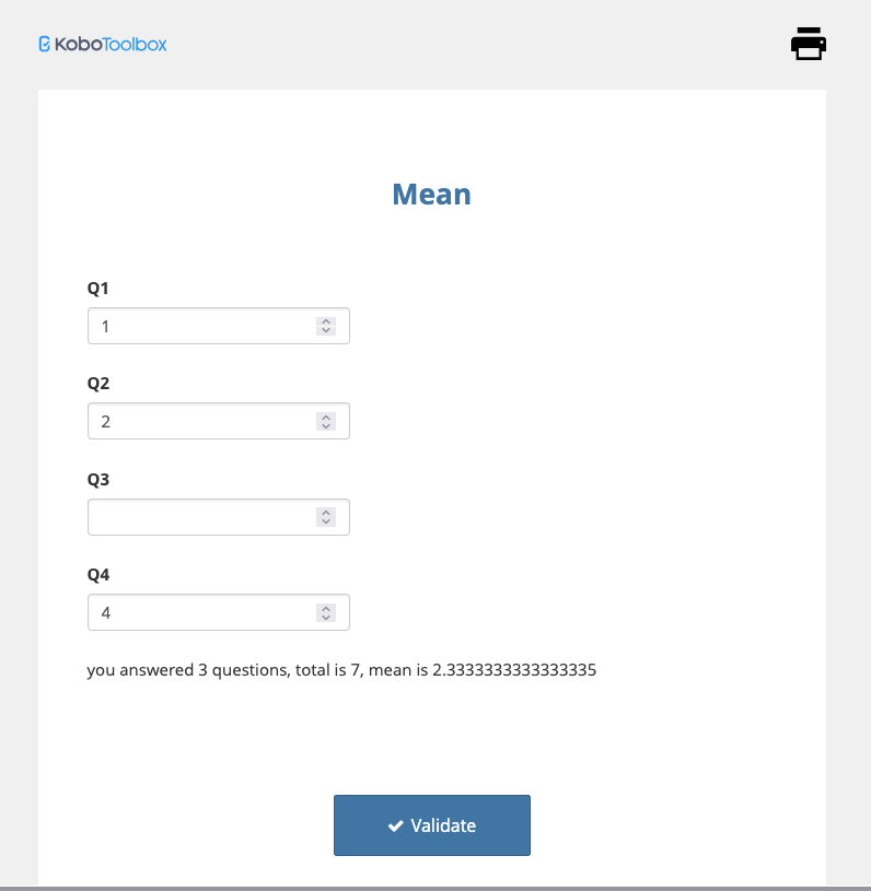I am building a form- a methodology to assess farmers’ practices we want to launch on KoboToolbox- and I have some questions that are straightforward (with numbers, range and “select many” question type) and no problem with them. Instead, a couple of questions need to be the average mean of “subquestions” (1-5 points, with a range of 0.5 each). One has two subquestions, the other one has 12 subquestions. My first issue is that I cannot find a mean (average) type among the “calculate” questions. My second issue is that the 2 and 12 questions, respectively, are not all compulsory (as they may refer to some topics that a farmer is not specifically involved into), so my question is how to actually create a calculate question with only the questions actually answered.