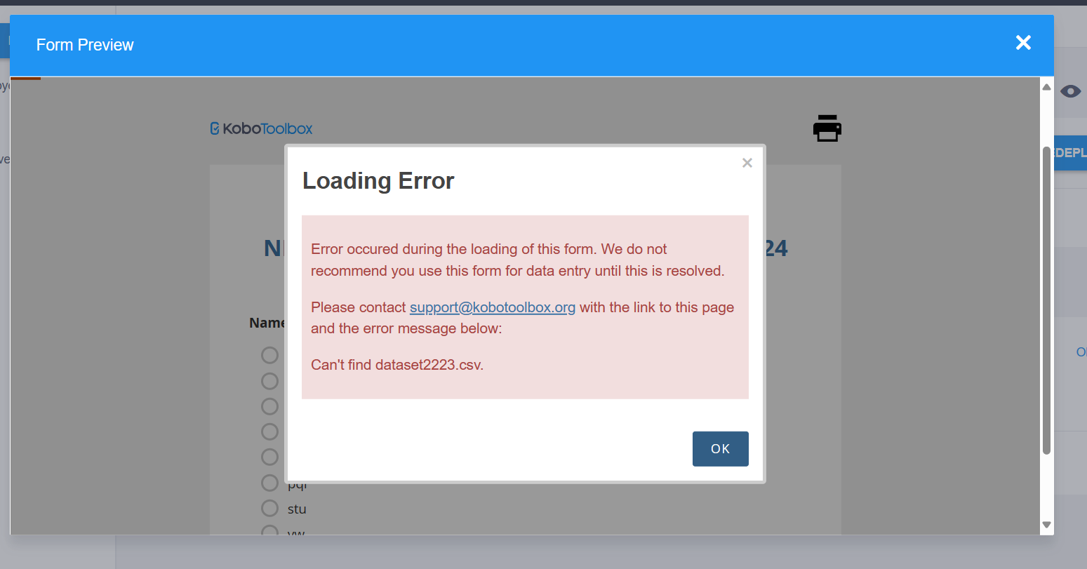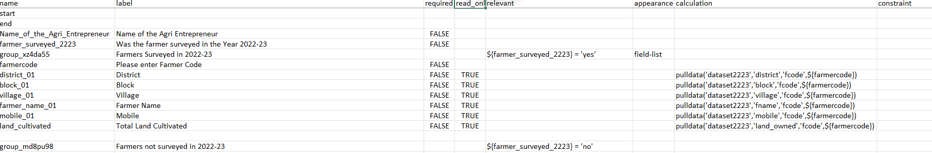 Unexpected KoBoCAT error 400: b’{“detail”:“There has been a problem trying to replace ${'ID_PROD'} with the XPath to the survey element named ''ID_PROD''. There is no survey element with this name.”}’