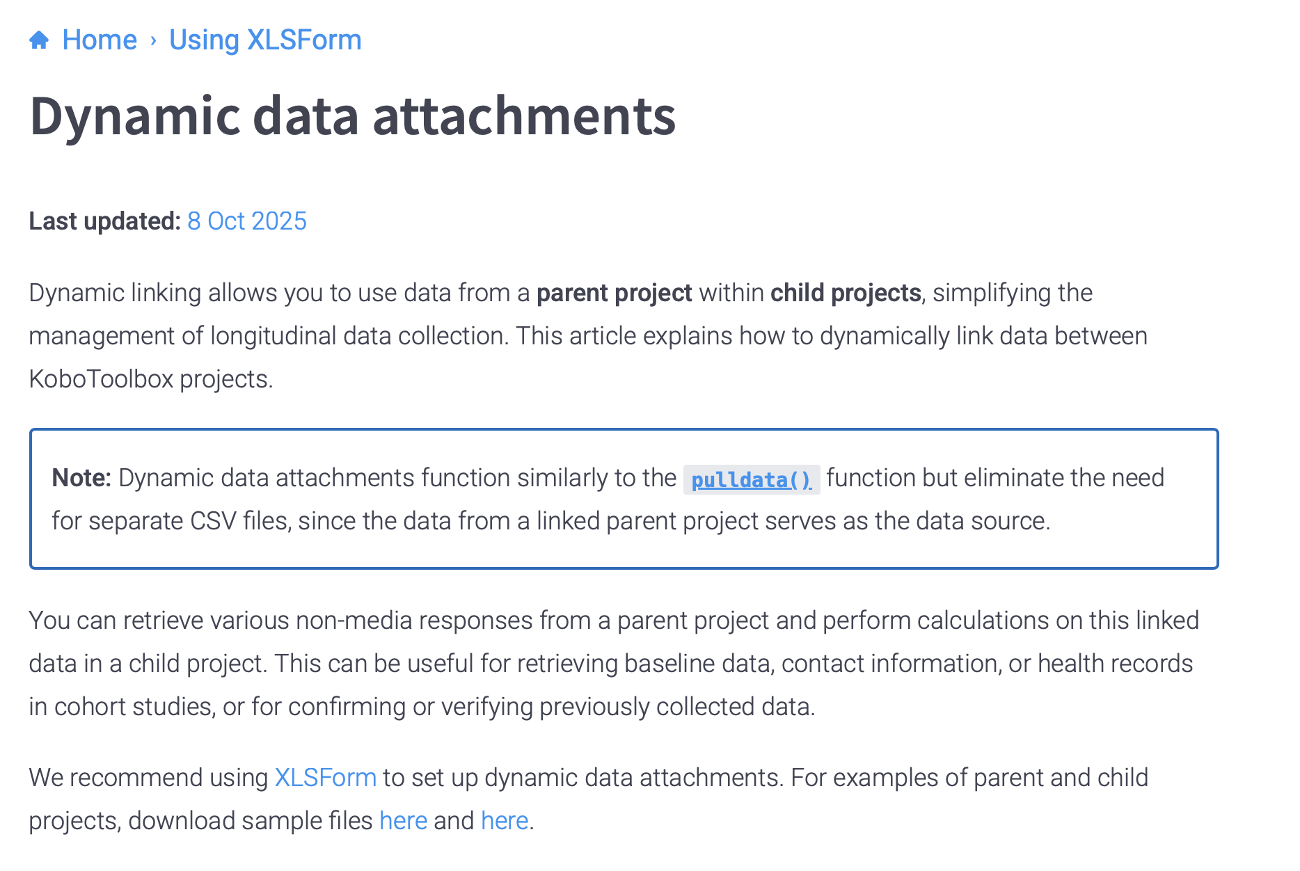 Dynamic linking allows you to use data from a parent project within child projects, simplifying the management of longitudinal data collection. This article explains how to dynamically link data between KoboToolbox projects.