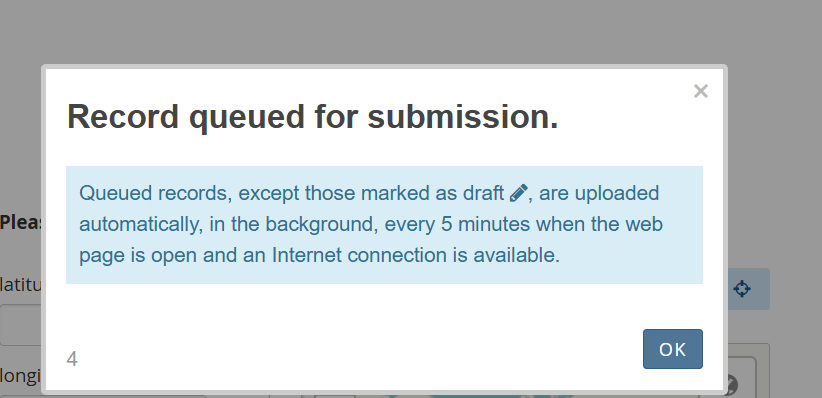 I am seeing the message “Record queued for submission. Queued records are uploaded automatically…” when submitting my form. I have already waited more than 5 minutes as mentioned, but no data is uploading — everything stays in the queue. This issue is happening for all users. Why is this happening, and how can we fix or disable this behavior?