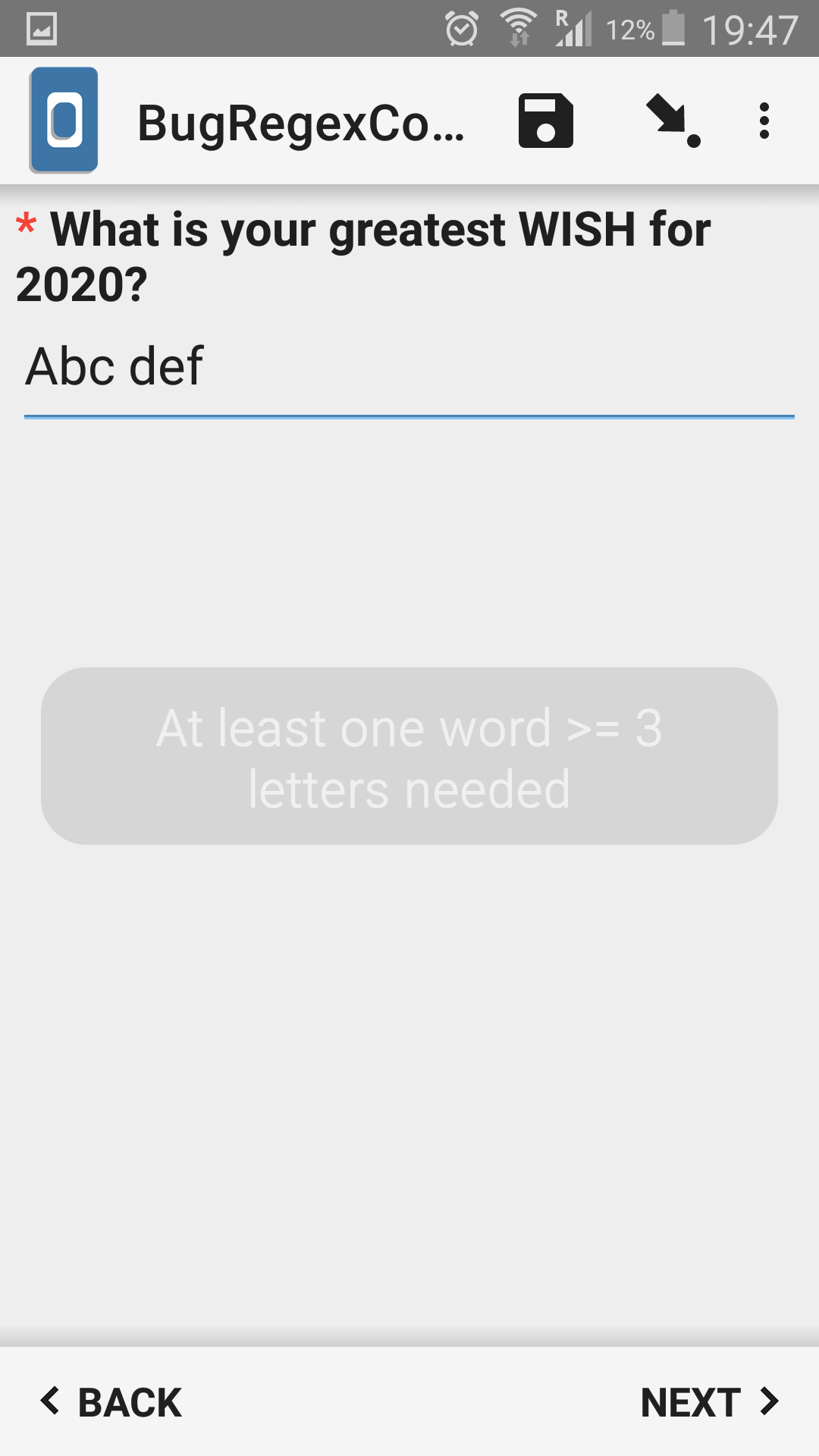 A regex constraint to check a text field for at least one occurrence of a word with 3 letters works differently in KoBoCollect, and we think wrong.