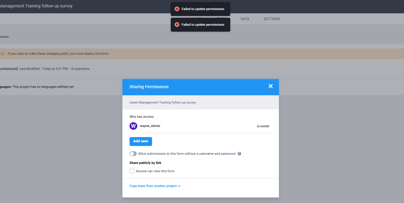 I am currently using organisation Kobtoolbox Account. Last year i was able to create Project and share with the team as url for data collection without even them having Kobotoolbox account but just Web URL. Even with my Free version Kobotoolbox account i am able to share the Url link for data collection. Just this year with the organisation account its hard now to share with the other team members to collect data. It now require them to enter username and password after or before the data entry. Its really frustrating here. Dont know how am i gonna fixed this. Need assistance here