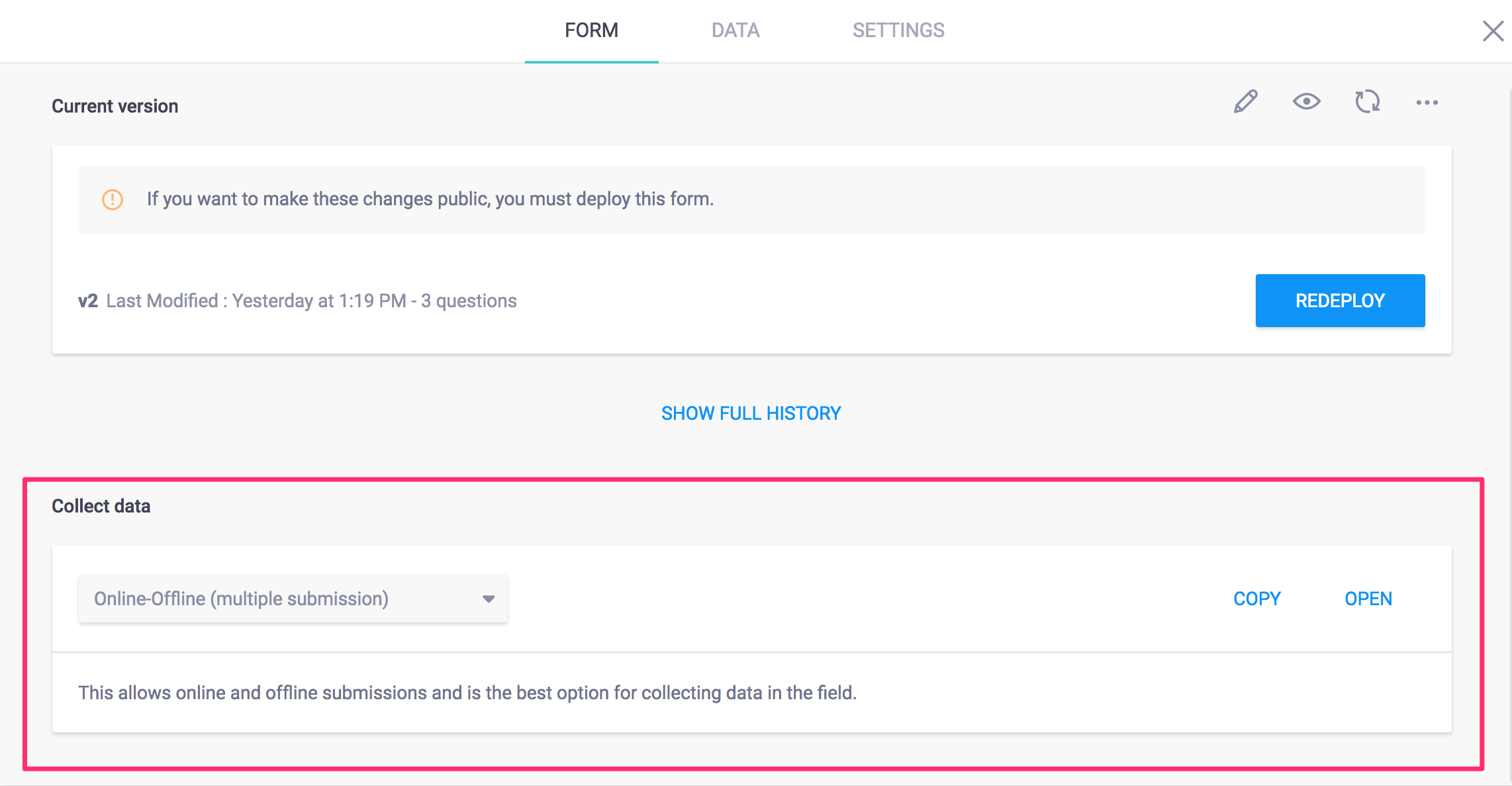 @danishjownaqibullah, please note that users cannot change the display settings under the Collect data. It is always visible in that particular mode (which you see) even if you refresh your browser, log out, and login back to your account. The only thing that changes is the URL link when users select COPY or OPEN from different options that are available under the Collect data [e.g. Online-Offline (multiple submission),Online-Only (multiple submission), Online-Only (single submission), Online-Only (once per respondent) and so on …]. Try copying all the URLs from these settings to a notepad, and you should see a clear difference in the URL link.