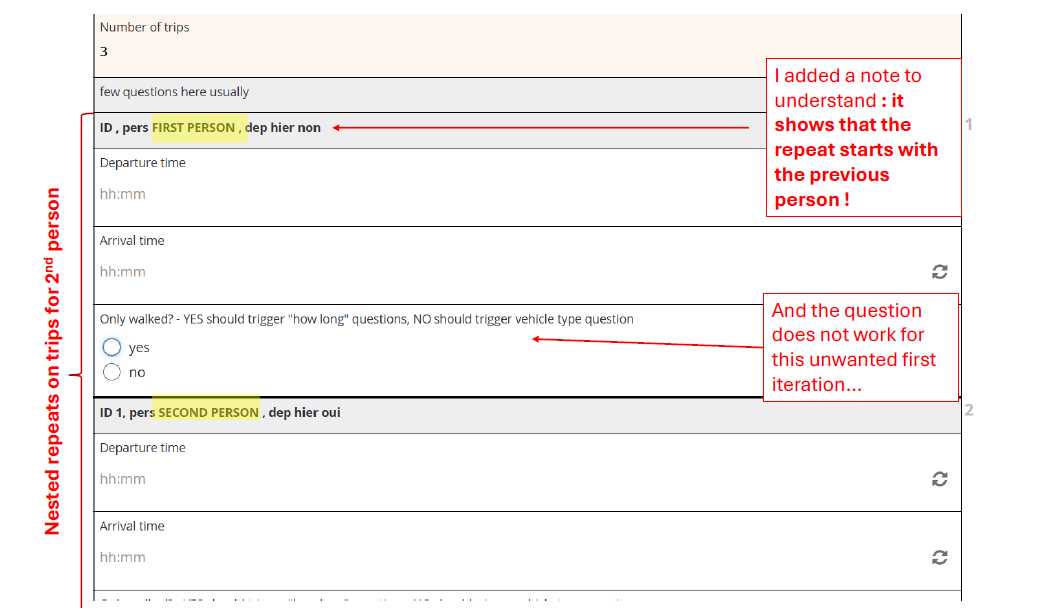 In the specific situation where the first member answered “No” to the filtering question, and the second member “yes”, then the nested repeat on trips of the 2nd member shows information (name here) of the first member, and does not work.
