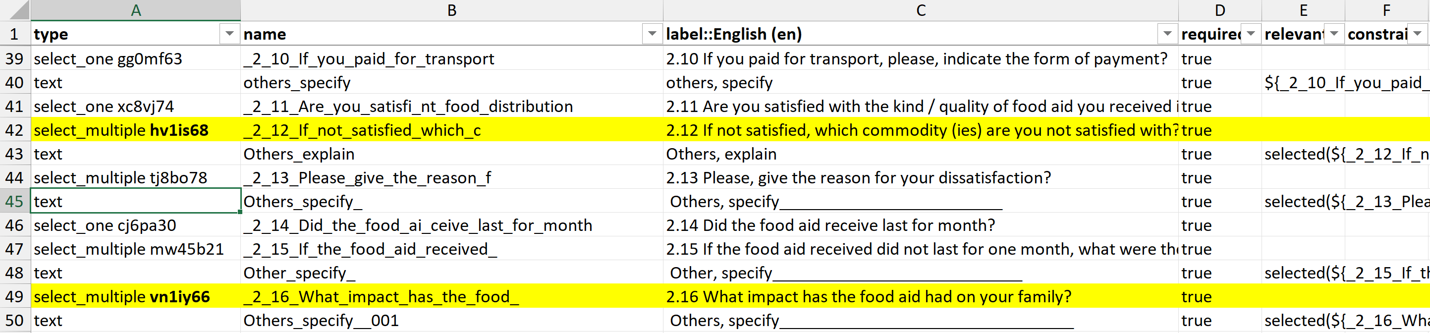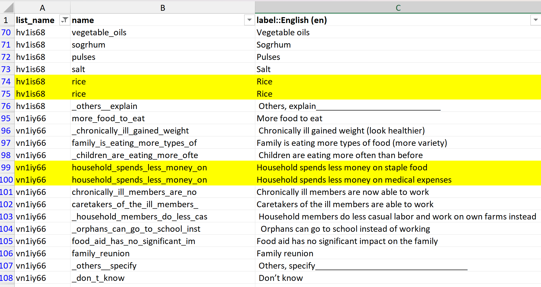 For 2.16 you will need to edit the “name” fields to be e.g. household_spends_less_on_staples and household_spends_less_on_medical - as currently both are household_spends_less_money_on so both answers have duplicate “names”.